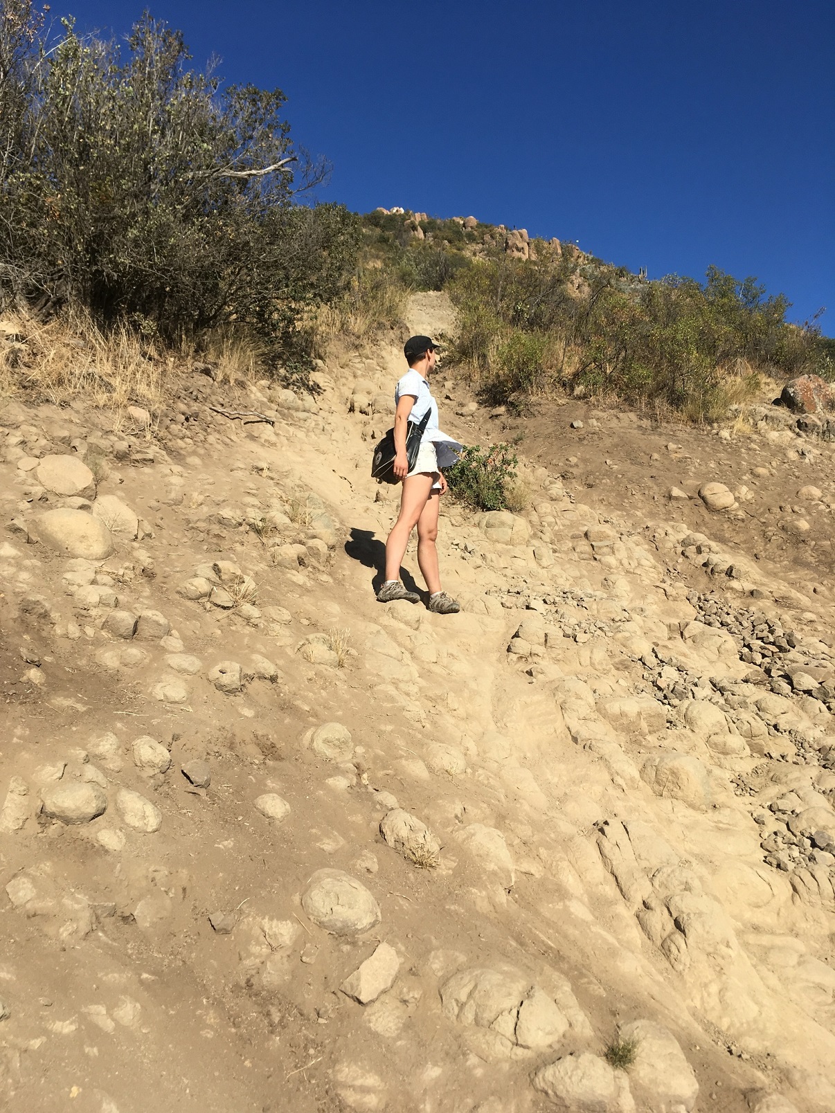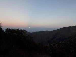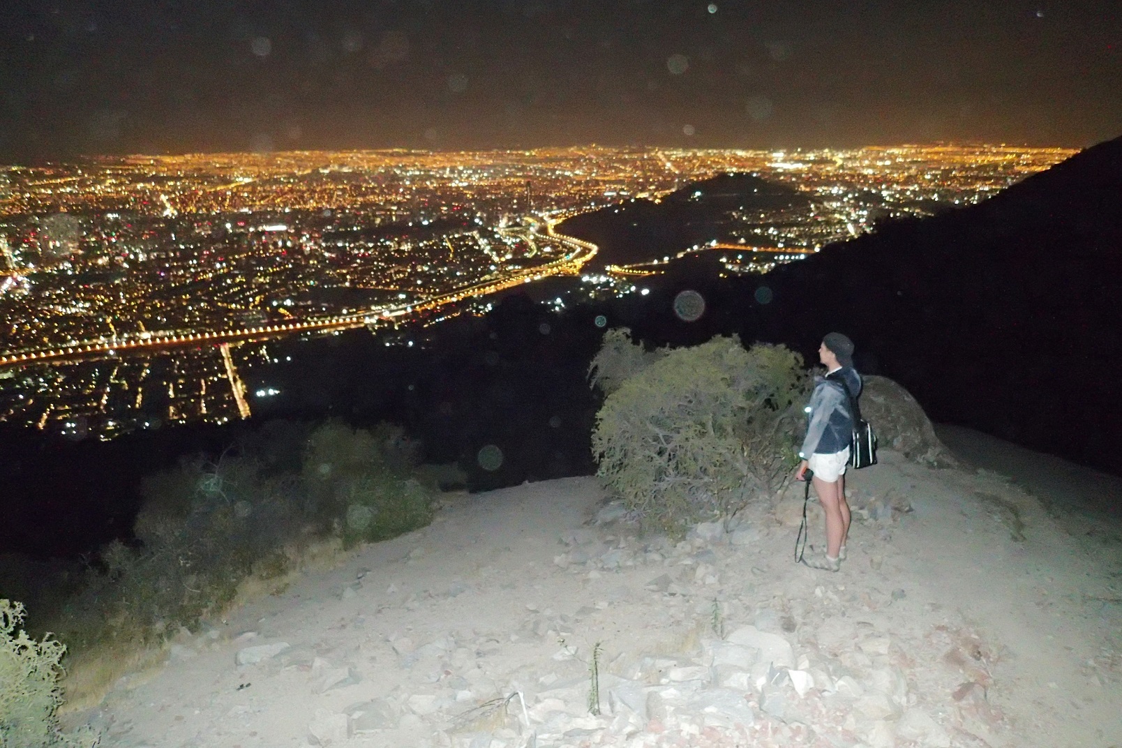 We arrived at the feet of the mountain by bus, passed the small glamorous neighborhood full of beautiful houses, and at the beginning of the trail found a fence – yes, Chilean people love fences! So we headed to another trail about 500 meters away, started going on it and got lost almost immediately. It was pitch dark since the moon was on the other side of the mountain, and there were a lot of overgrown bushes on our route. And we were crawling to the peak as very clever people: Tim with sandals, me with Converses, and both with just flashlights of the phones. Headlights? Oh, no, it’s not going to be that serious there, we thought before. And now we were literally crawling since the slope was steep and everything was crumbling under us. The abyss under the slope was terrible, and we had to be very careful: every single move could be fatal. Somewhere in the mid of the route, I notified Balter, who was waiting for us in the capital and in San Antonio and with whom we hadn’t met yet, about our location, and asked him to call the rescuers, if he doesn’t hear from us after midnight: yep, even I can feel uncomfortable at some moments. It happens 🙂