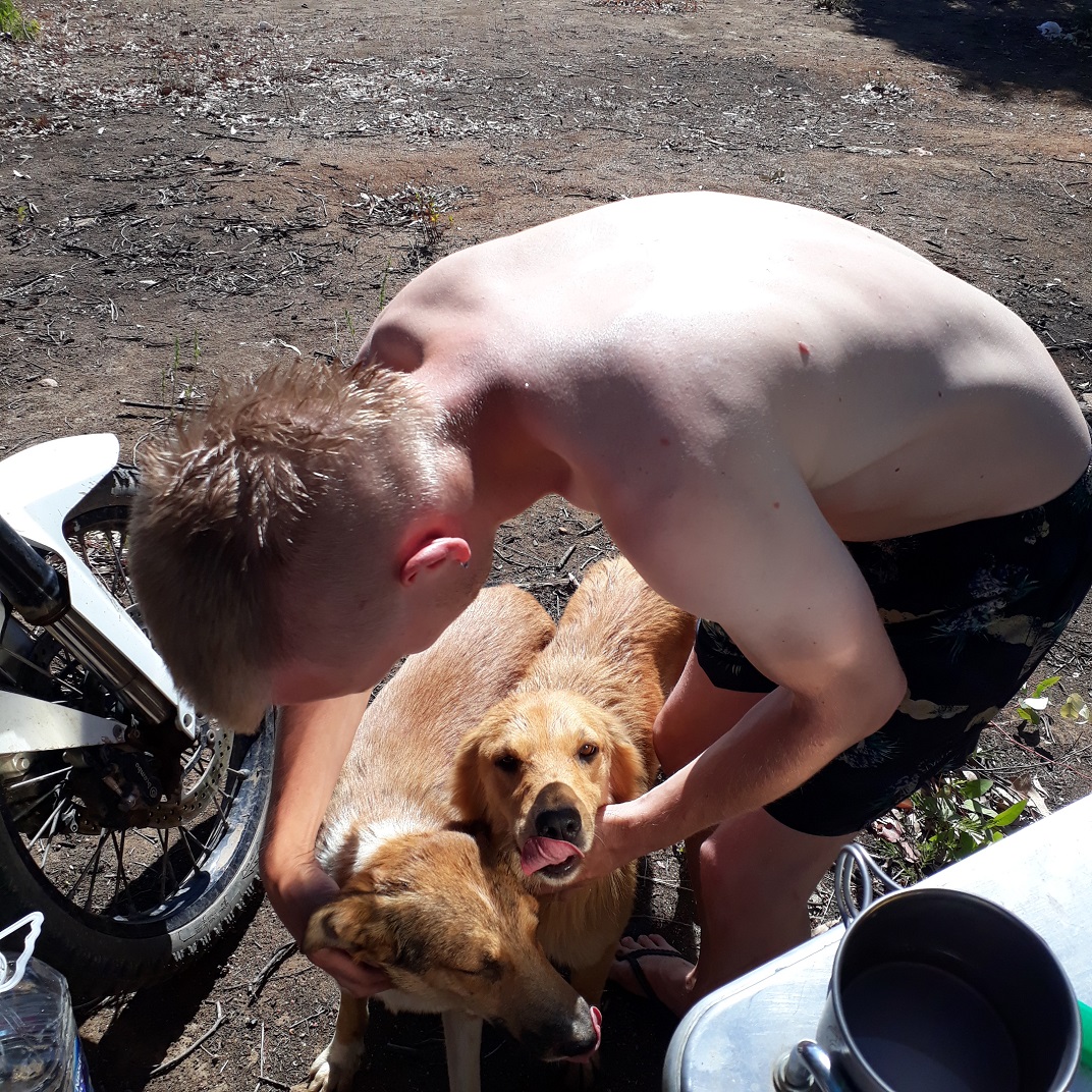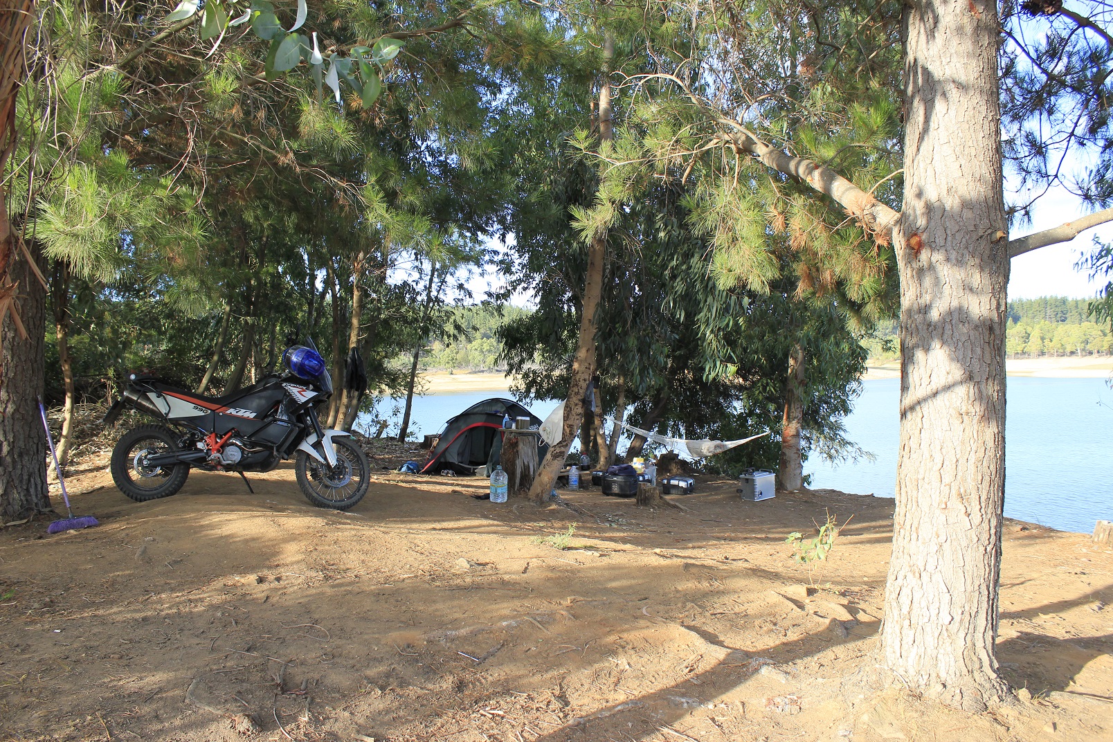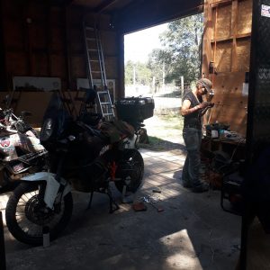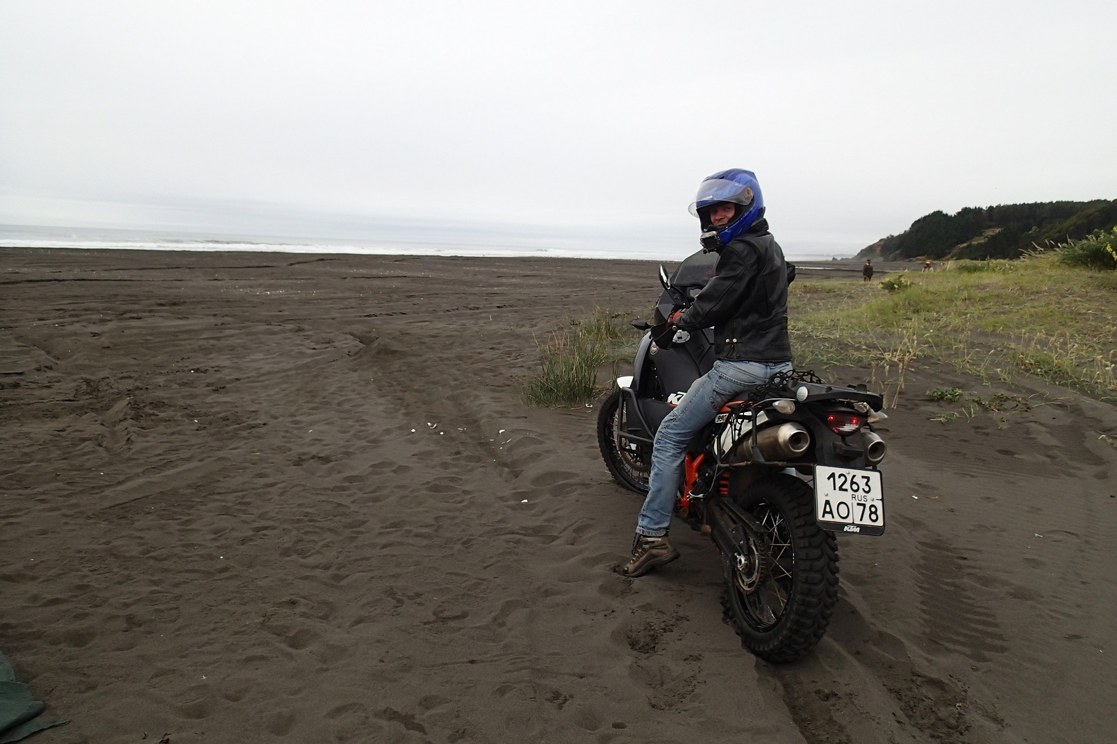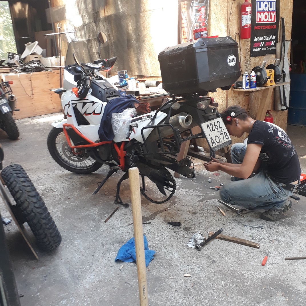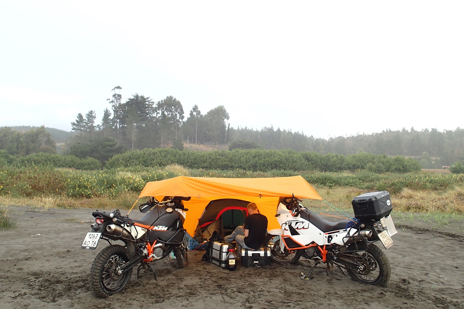 Leaving this lovely peninsula a dirt road, Tim heard some rumble coming from his fork. It turned out that the people from the garage in Conce did not tense the bolts properly, and one of them had already gone. Everything was hanging very loose and the fork had small leakage again. The issue with the bolt was resolved at the nearest gas station. While we were checking the bolts remained in the fork, some lady came up to us and handed us a bottle of cold juice – apparently, we had a very miserable and exhausted look. After that, we had a small ride along the coastline and stayed on the beach for two or three nights to spend some time working. We were charging laptops from the bikes with a voltage converter. Not a perfect option, but it works.