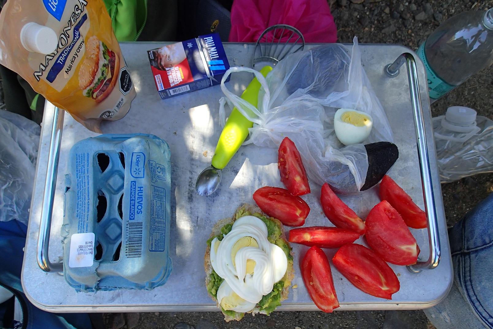 While traveling in austerity mode, we ate just rice and lentils. For breakfast, we had rice with boiled condensed milk, and dinner was usually with lentils, canned fish and mayonnaise. We had also bread but in Chile, you cannot find rye bread and have to be happy with wheat. We were also missing buckwheat and we miss it still all the time having even hallucinations while looking for something along the shelves in a supermarket. Avocados were also a good option to have during the ride and cooked eggs as well: quick and cheap. Everything is possible with a desire!