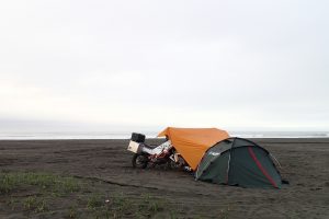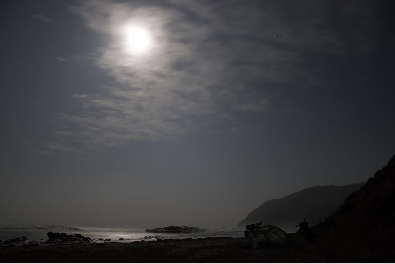 Tim’s fork was repaired in some kind of moto service, but the result wasn’t that good. The brake caliper began to cling to the brake disc making it hot, so the next day we had to go to the same place back again. They fixed the mistake and we were now able to continue the ride! Leaving the farm, we headed to the peninsula, where we pitched a tent on the ocean. The road was so beautiful there! Good asphalt, proper curves, nice views… and there was no connection at all. At night, after some wine, we went for a walk along the coast. The moon was huge… While we were sleeping, I woke up several times and thought that we were going to be washed away by the tide – but no, the water had not reached us and stopped approximately twenty meters away. Later we were doing as smart people do: we began to uugly the maximum tides just in case. It would not be very cool to be swallowed up by the ocean with our bikes and tent!