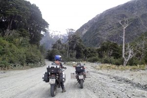 В первый день мы проехали километров двести, не больше. Встали на берегу чистейшей реки, прямо под мостом, и наутро двинулись дальше. Основная дорога этих краёв называется Carretera Austral, про которую ещё говорят, что её начало – там, где заканчиваются все дороги. В каком-то роде это так и есть. Асфальт есть только до города Villa Cerro Castillo, а дальше – извольте, вот вам грунтовка. И это главная трасса в этих краях. Первый участок грунтовки мы проходили уже на следующий день, и он меня удивил: всё было ок, я держала примерно 80 км/ч и хотела поскорее добраться до лютого серпантина, обозначенного в навигаторе каким-то ленточным червём. Только вот прямо перед этим серпантином у меня ВНЕЗАПНО заглох байк и отказался заводиться. Связи нет, впереди гора, до ближайшей цивилизации ехать полвечности, что делать – да совершенно не ясно. Оказалось, всё просто: тише едешь – дальше будешь! Ибо от колдобин на большой скорости растрясло клемму аккума и она просто болталась, то давая контакт, то нет 😀 Но сиканула я нормально. Горный серпантин оказался тоже грунтовкой, но в поворотах-шпильках был не самый адский подъём, и его мы прошли нормально. Дальше снова был асфальт и сногсшибательные виды вокруг… И под конец райда – стоянка на берегу реки, куда не заехать ни на чём, кроме велика или мотоцикла. Мотоциклы мы туда тоже еле затащили, но затащили же! Пережидали там дождь две ночи, пытались ловить рыбу вопреки сезонной информации, ничего не поймали, работали за ноутами и я даже помылась, но на этот раз уже не целиком: башку в эту воду засунуть просто невозможно. Мозг замёрзнет и раскрошится!