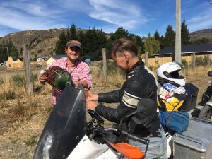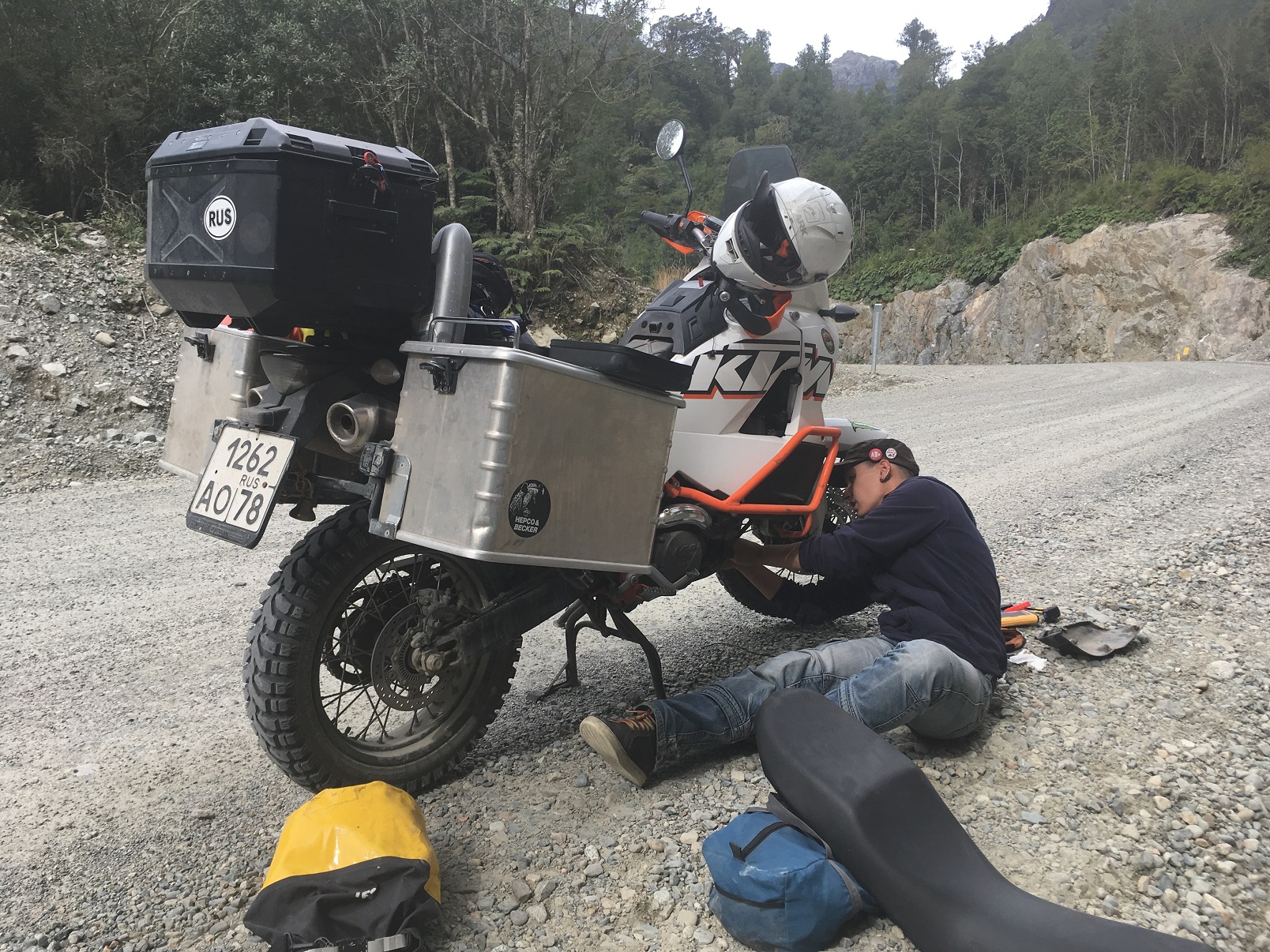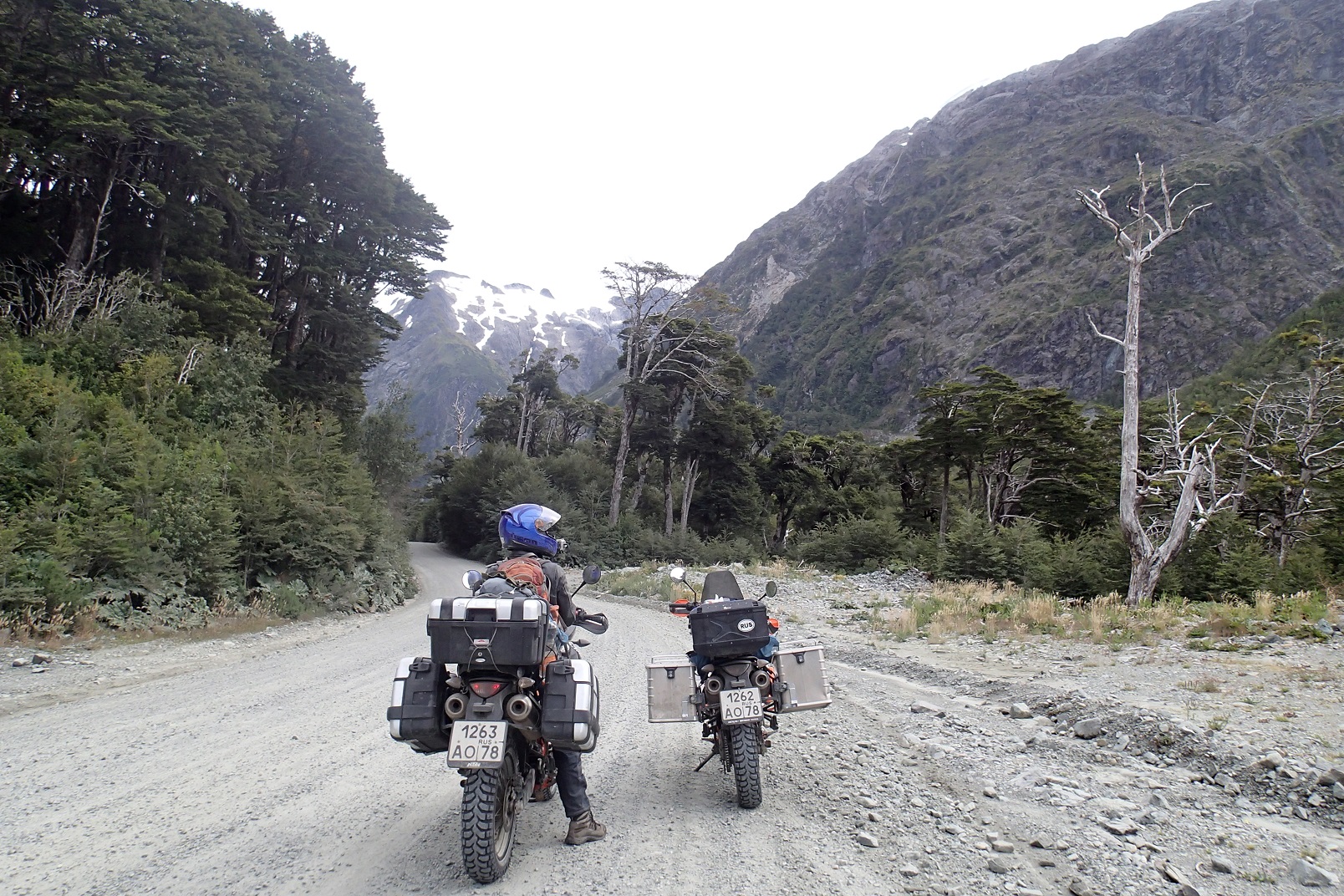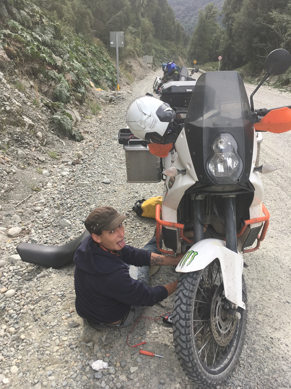 Вытаскивать байки из этого прекрасного места после суток дождя было забавно. С помощью друг друга, придерживая и подталкивая, без кофров… но мы сделали это. В промежутке даже разобрали мой мотоцикл, ибо из него потёк бенз откуда-то сбоку. Скинули дуги, пластик, бак, ничего не нашли и поставили всё обратно. Течь перестал! И погнали. На этот день у нас были очень большие планы, но мы задержались сначала с разборкой мотоцикла, потом в маленьком городке Пуэрто Айсен, где получали на почте мою банковскую карточку, выясняли возможность заказать контактные линзы, покупали фонарики, я безвозвратно потеряла свой ключ от байка… Да, это было очень гадкое чувство. Я обошла все места, где была до этого, ибо всё это в одном квартале, везде спросила, но ключа нигде не было. Меня спасло моё раздолбайство: запасной ключ лежал в рюкзаке, рюкзак в кофре, а ключи от кофров – в бардачке байка. Бардачок открывается и закрывается с того самого потерянного ключа, но как же прекрасно, что у меня так и не выработалось привычки его запирать!