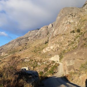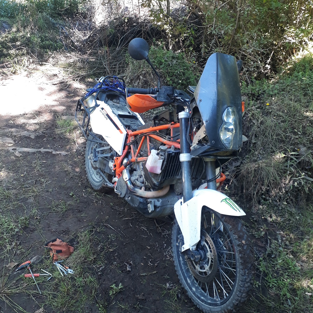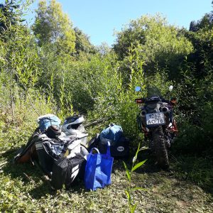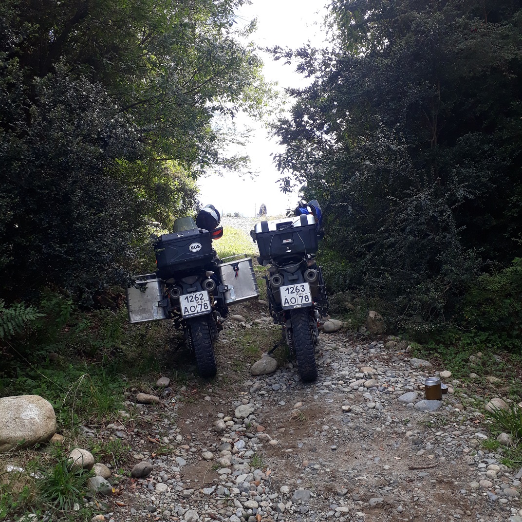 Казалось бы, да? Ну грунтовка, ну и что? Я тоже так думала. Вариантов-то всё равно нет, и пора бы уже наконец научиться нормально ездить по любому покрытию. Но… нет. Крупный рыхлый гравий толщиной в несколько сантиметров был другого мнения. В первый раз я разложилась после расколбаса, который мне не удалось победить, открутив газ. Всё обошлось, и я даже сама мотоцикл подняла со всеми кофрами. Едем дальше. Впереди – велосипедисты, которые едут в одном направлении с нами, но по встречке, т.к. там грунтовка полегче. Я еду по своей полосе. В тот момент, когда я их почти догнала, появляется встречка и они резко берут вправо прямо передо мной. Какие варианты? Маневрировать и раскладываться или тормозить и раскладываться? Я выбрала второе. Секунды через три после начала торможения я падаю, еле не сбив этих ушлёпков (ну слов других нет, чесслово!), и они ко мне сразу: а ю окей? Ю окей? В попытках поднять байк кряхчу и мотаю башкой: нет, мол, не окей, блин! Стоят. Один из них начинает чистить банан и ест. В этот момент подоспевает Тимофей, мы вместе поднимаем байк и едем дальше. Всё обошлось и на этот раз, но нервная дрожь после этого инцидента никуда не делась, и дальнейшая дорога давалась мне ещё тяжелее. С одним перекуром, красивыми пейзажами, резкими спусками-подъёмами, очень узкими участками, мы потихоньку продвигались на юг. В какой-то момент до этого меня ещё чуть не сбил чел, начавший обгонять фуру в огромном облаке пыли… Спасибо дальнобою: он оттормозился капитально и обгоняющая его машина прошла в паре метров от меня. Уфф… Выдохнула.