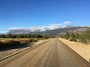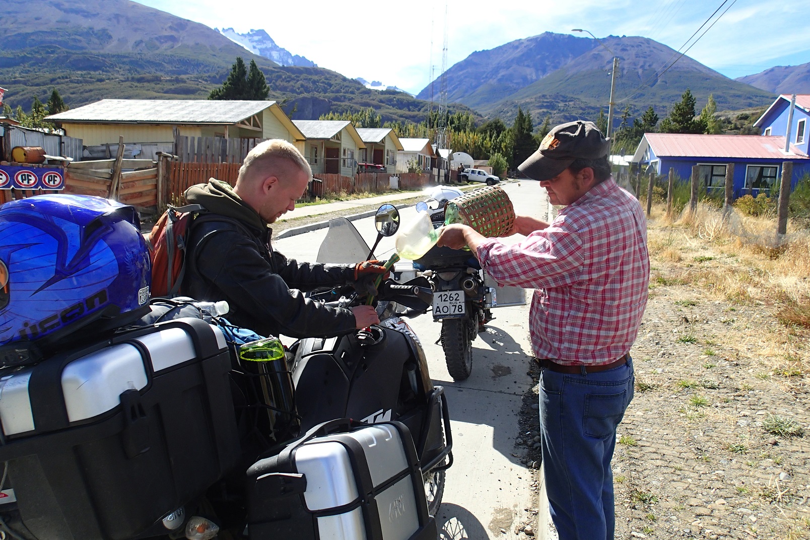 Карабиньерос говорили, что нормальная дорога будет ещё несколько десятков километров и на этом всё. Они не обманули. Заправок по пути тоже не предвиделось, и нужно было как-то выкручиваться. Прохватив красивыми пейзажами, мы приехали в этот милый городок, который Villa Cerro Castillo, заценили вид на гору и серпантин, купили 93-го бензина в маленьком магазинчике… Да, это было действительно забавно. Из стеклянных склянок в корзинной оплётке мне ещё ничего и никогда в баки не наливали! И двинули дальше. И скоро началась та самая грунтовка.