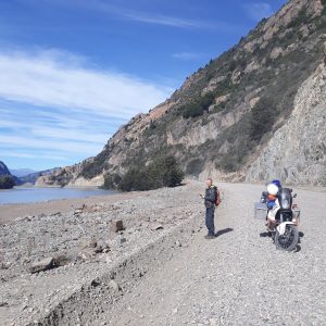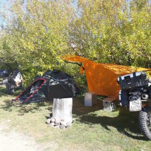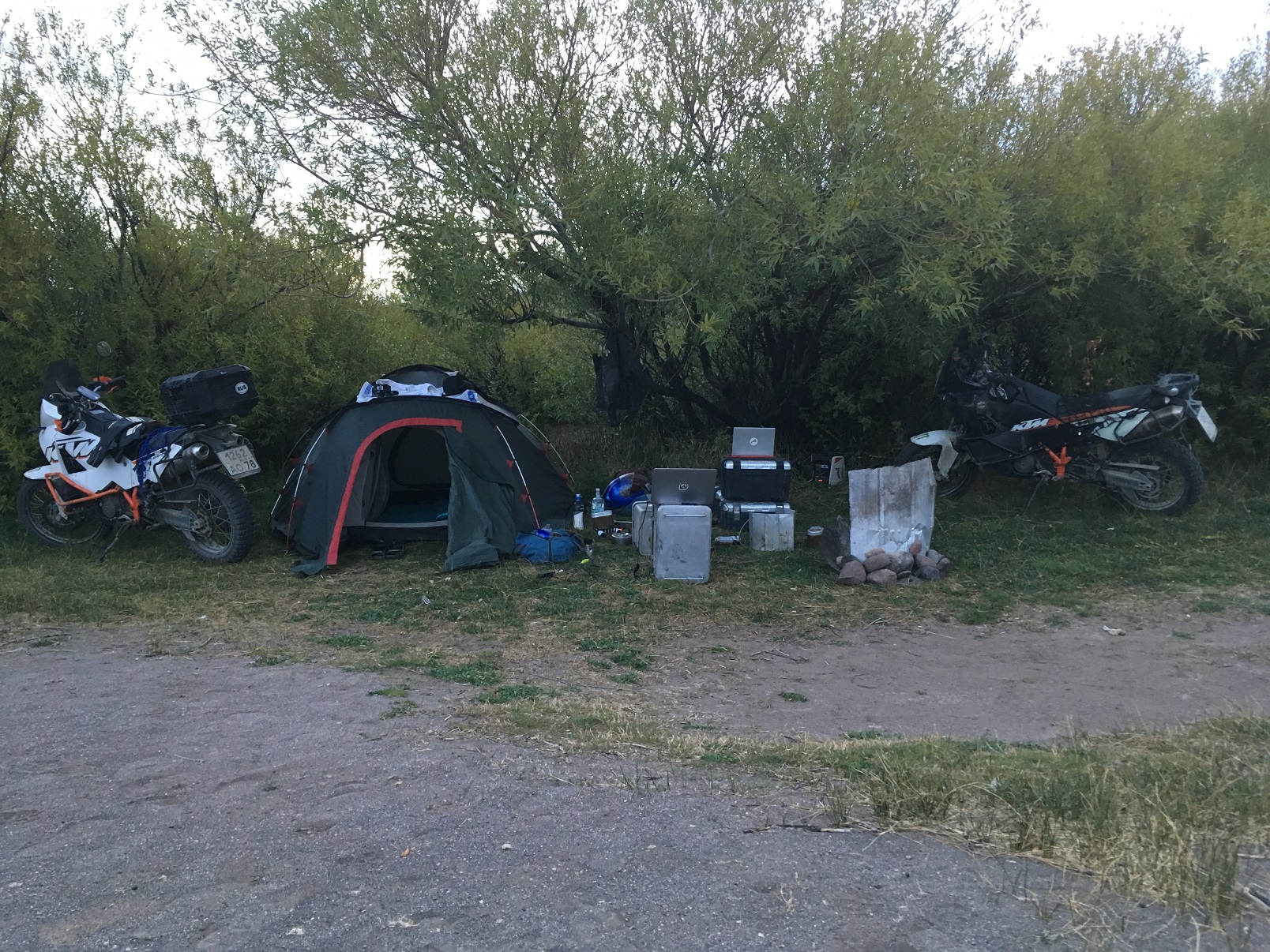 Мы приехали к берегу, где намеревались встать, уже затемно. В небе торчала жёлтая полная луна и дул сильнейший ветер. Холодно. Палатку поставили где пришлось, чтобы особо не плутать в темноте, а на следующий день уже перебазировались на большой песчаный пляж с кустами. И даже дров там нашли. Обосновались капитально и айда работать! Каждый вечер наблюдали огромную луну, восходящую из-за горизонта и отражающуюся в озере; очень красиво. Я такого ещё ни разу не видела, а тут несколько вечеров кряду… К вечеру третьего дня у нас закончилась еда, и нужно было решать: едем мы в магазин за едой или в Аргентину? Я поехала в магазин городка Чили Чико, вернулась обратно и, несмотря на холод, психанула: пошла мыться. Забегаю в озеро, бегу-бегу, а воды по колено! Ладно, котелок в помощь. Набрала воды, пообливалась, помылась кое-как и снова за работу. Если вода в озере кажется слишком холодной для того, чтобы помыться – значит, ты ещё недостаточно грязный! Уехали мы оттуда через два дня. В Чили Чико сделали аргентинские страховки для байков, прошли границу, разжились местными симками, поселились в маленьком домике и вырубились оба на раз-два. Первая ночь в кровати после трёх недель в палатке! Сильно!