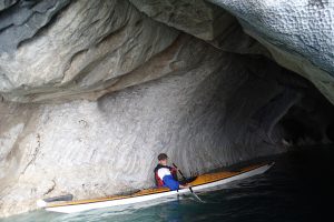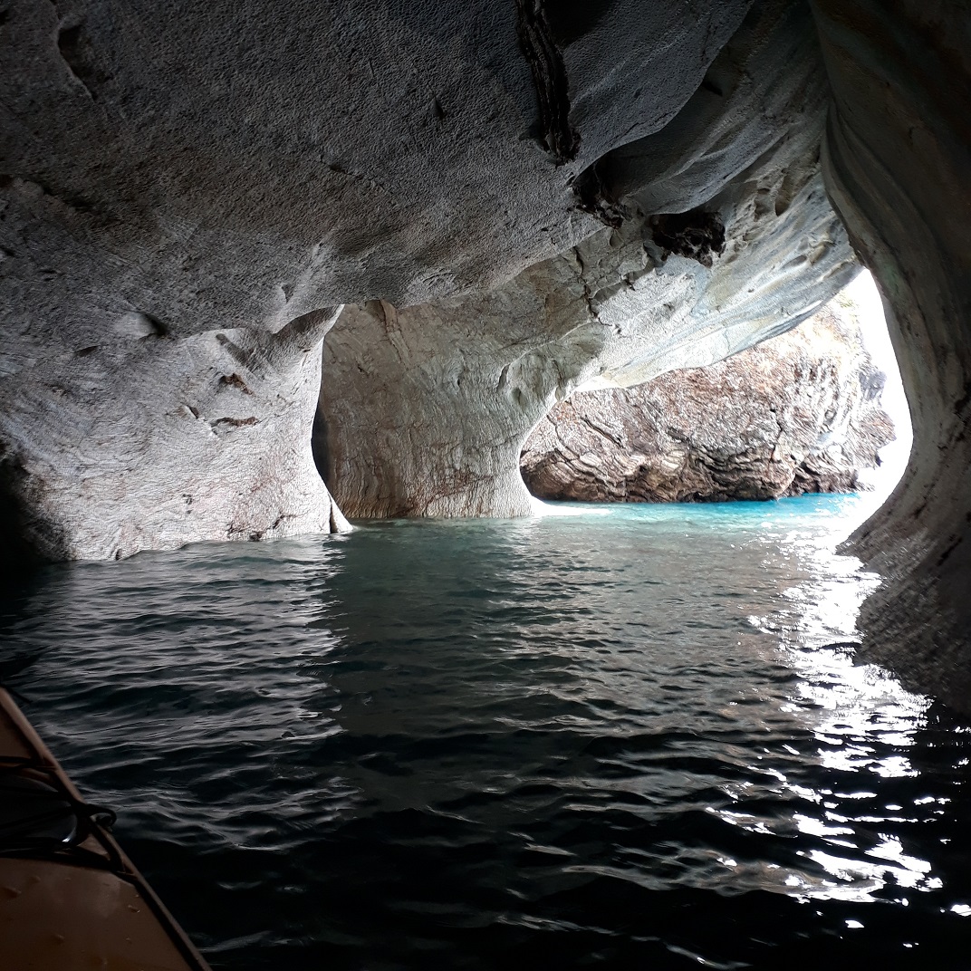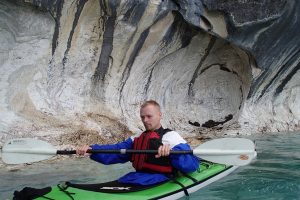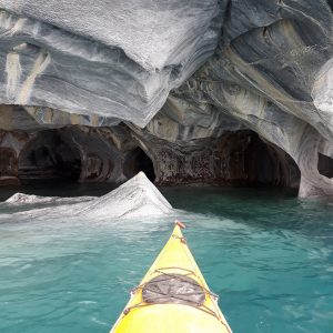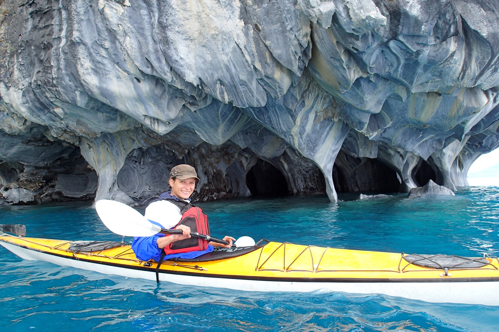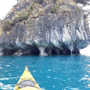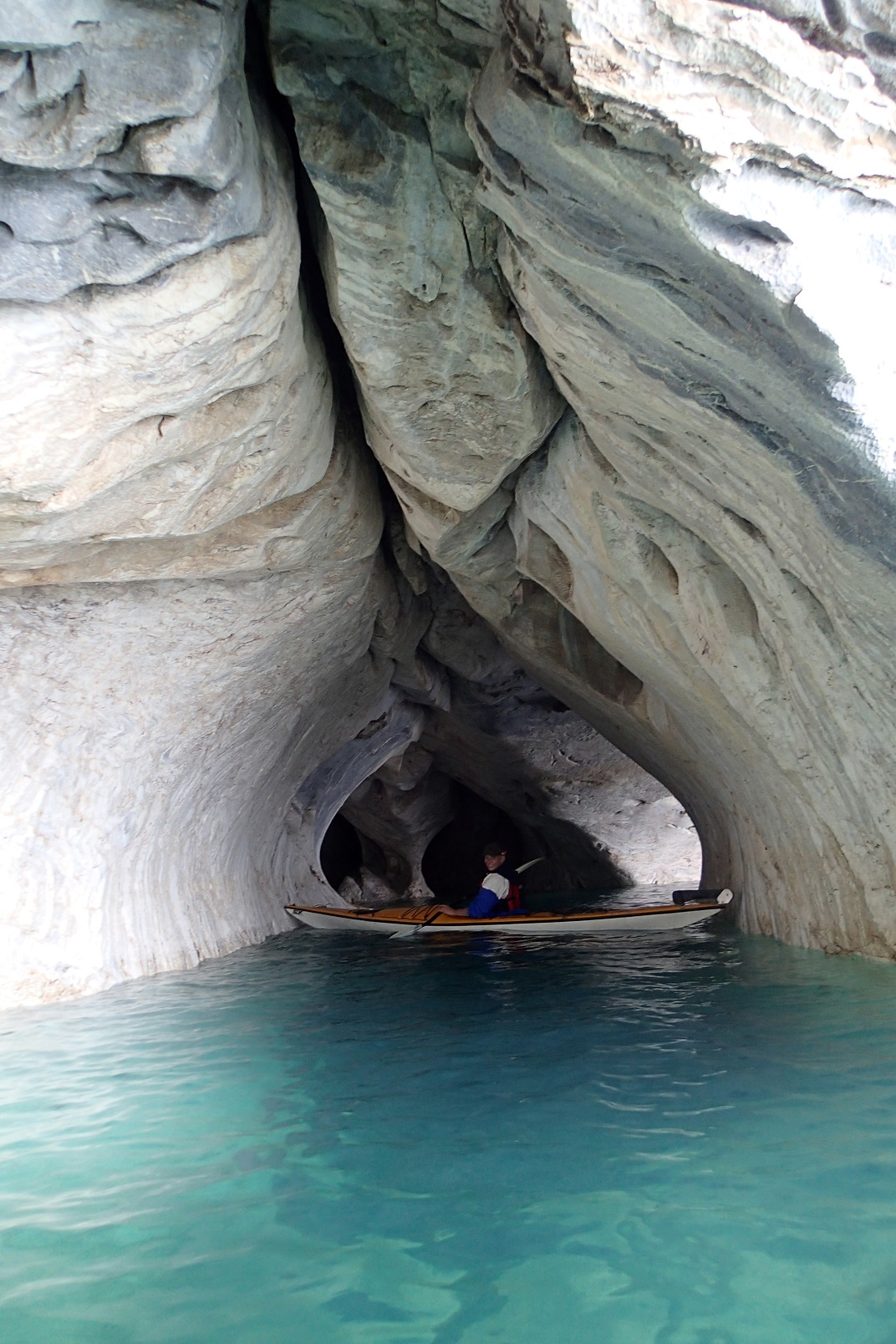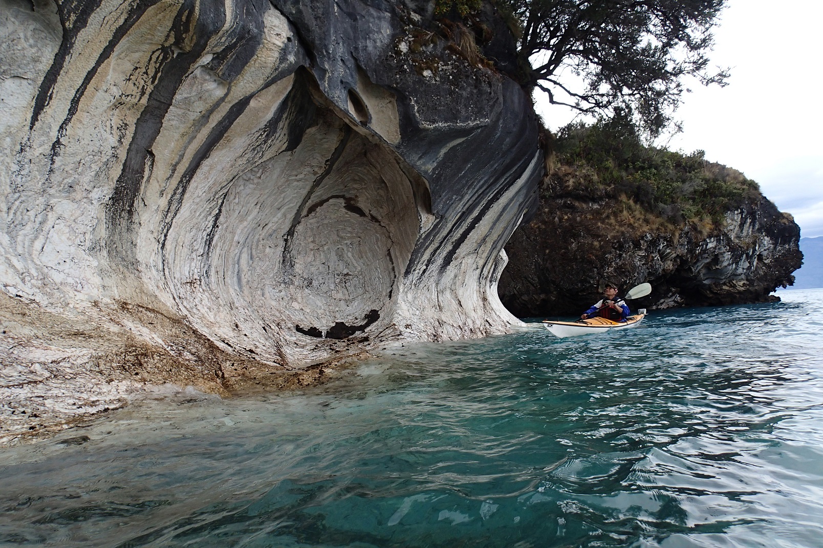 Часам к восьми вечера мы наконец добрались до маленького городка Puerto Rio Tranquilo, что стоит на берегу огромного озера Хенераль Каррера, или Лаго Буэнос Айрес: это смотря в какой стране о нём говорить. Озеро одно, а стран – две! О нём расскажу ещё чуть позже 😉 Заправили байки, нашли какой-то кемпинг с яблоками и сливами, но хозяина кемпинга и сеть не нашли. Нас встретил чилиец из Пунта Аренас, который живёт в этом кемпинге вот уже месяц как со своей девушкой-японкой. Совершенно не понятно, как они между собой общаются, ибо английский оба знают очень плохо, но это не наше дело 😉 Патрисио – так его зовут – рассказал и показал нам всё, мы поставили палатку, накатили рома на сон грядущий и завалились спать. Очень тупая местная собака за ночь полностью уничтожила наш пластиковый контейнер с едой… В этом кемпинге было одно прекрасное кое-что: нормальный душ! Вот мы и застряли там на четыре ночи, посвятив кучу времени работе. Но дело было, конечно, не только в работе: на озере Хенераль Каррера находятся так называемые мраморные храмы, или мраморные пещеры – кто во что горазд. К ним можно сходить на экскурсионной лодке, но разве это наш вариант? Конечно, нет, и конечно, каяки! Весло в руки и вперёд с песней!