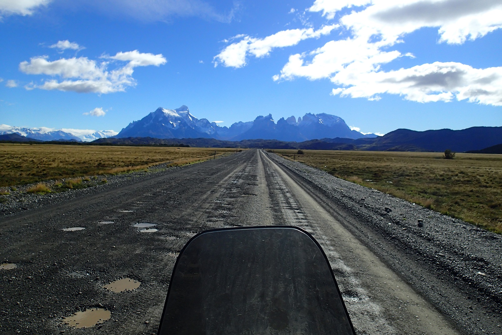 Путь лежал сначала в Пуэрто Наталес, где нужно было оставить ненужные кофры, а оттуда в национальный парк Торрес-дель-Пайне. Много кто из встреченных нами в Аргентине ребят туда не ездил, сославшись на высокий ценник, особенно для тех, кто не из Чили, но один перуанец нам всё-таки рекомендовал это место и советовал не экономить. Что ж, в путь! В Пуэрто Наталес, что в ста с лишним километрах от парка, всё очень дорого. Кофры мы там оставили в кемпинге и за это с нас попросили вроде бы двести рублей за сутки. Мы сразу сказали, что вернёмся «наверное, завтра, но может и позже». И уехали. Бензина нам должно было хватить впритык на то, чтобы проехать национальный парк по кругу и вернуться обратно, никуда не заезжая.